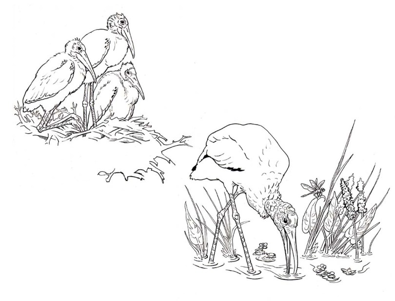 Wood Stork illustration January 19, 2014 1040 × 793 Wood Stork: EVERGLADES An ink illustration, derived from watercolors done at Paurotis Pond, Everglades – used for an educational activity included in the Tropical Audubon Publication.