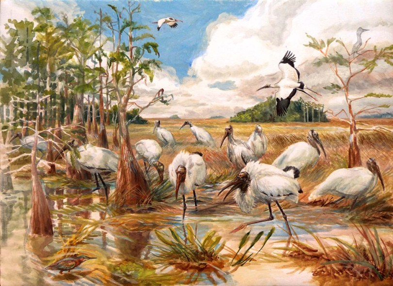 Breeding Wood Storks require a fairly low and decreasing water level to concentrate needed food resources for successful feeding of their young. Too much or too little water can cause abandonment of the breeding colony. Below, storks compete at a feeding hole near Pa-hay-okee during the dry season. Dominant adults strut with erect feathers to protect territory.