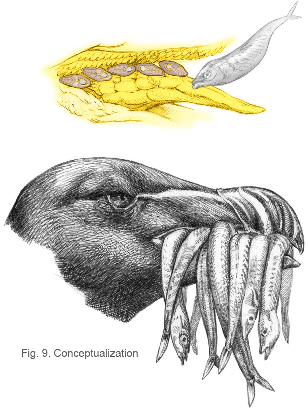 Click to enlarge – Various sketchbook studies of Golden-headed Manakin males engaged in lekking behavior, which includes sideways dancing, foot-tapping and sliding along display perches, vowing and chest-puffing, wing-vibrating, and darting up and down branches. Most of the sketches were done on February 2012, with touch-ups during February 2016 at leks within the Asa Wright preserve.