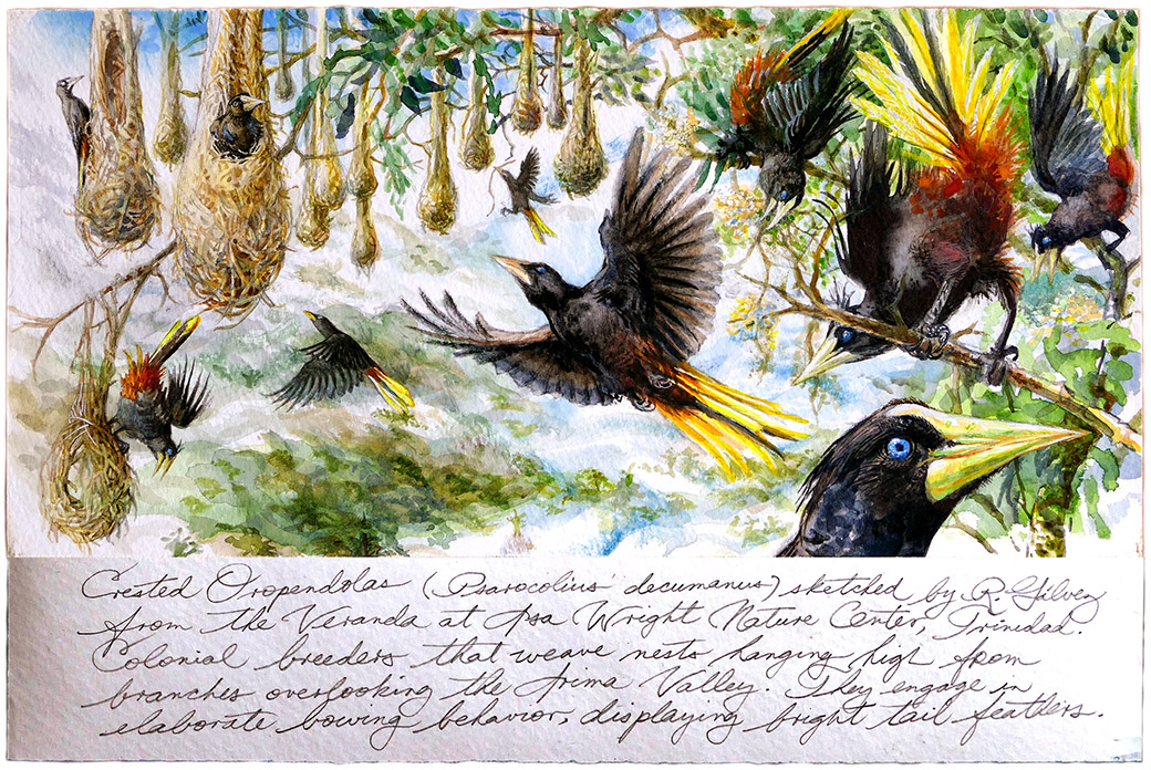Detail of a sketch (5.75″ x 12″) done at the Asa Wright Nature Centre veranda, Trinidad. This watercolor was started during June of 2012, and then finished during February of 2016. Crested Oropendolas are colonial breeders, and weave long basket-like nests suspended from the branches of large trees that hang over the Arima Valley.